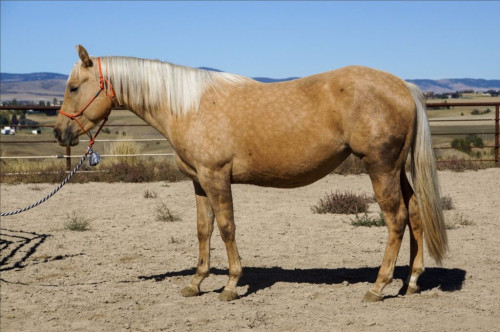 This is where beauty and versatility meet. Show stopping good looks with that gorgeous double mane, strong build, and a brain to match. Don’t let her papers fool you, although she’s bred to run she is ready to work in any direction you choose. Goldie is highly intelligent and will excel in any or many disciplines. She’s the kind that could win you all around titles or be the perfect partner on the ranch. She is ready to start her journey as a riding horse and would also make a great addition to any breeding program.