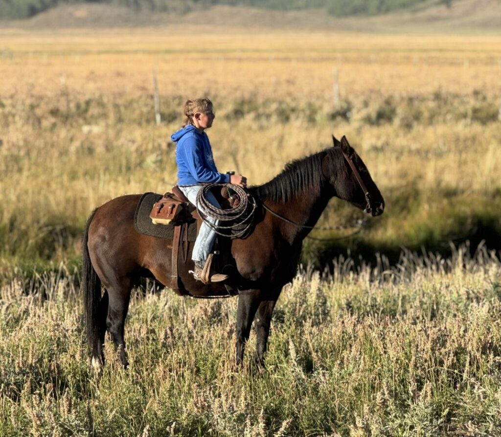Lexi has been the go to pony to teach our kids to ride and rope. She has been used extensively on the ranch. She had branded calves, doctored yearlings, and been on long hard days gathering. She keeps up with the big horses. We’ve used her on poles, my son has taken her out of the box a few times. If you’re looking for a confidence booster or a pony to teach someone how to ride and rope she fits that bill perfectly. She’s about 12.2-12.3 hands and is stout made. A small adult could use her all day with no issue.