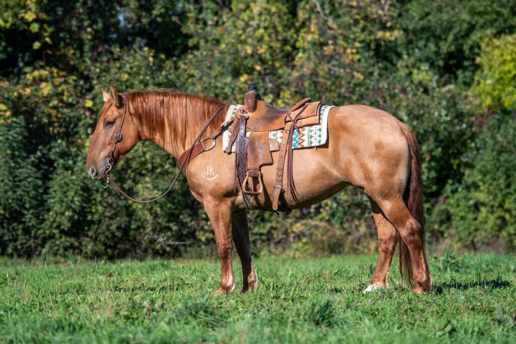 This is a big stout mare that was raised in rough country to be a mountain horse. She knows where her feet are better than most mules. She will ride and pack. She can pack a big load and travel like a little horse.