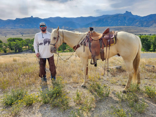 Around 16 hands. He’s coming out of the mountains of Wyoming and has done it all. Trail ridden extensively, packed elk, hobbles, ties, and handles rough terrain with ease. We’ve roped off him, and he’s been used all around by our family. He’s sound, gentle, and has a great mind.
