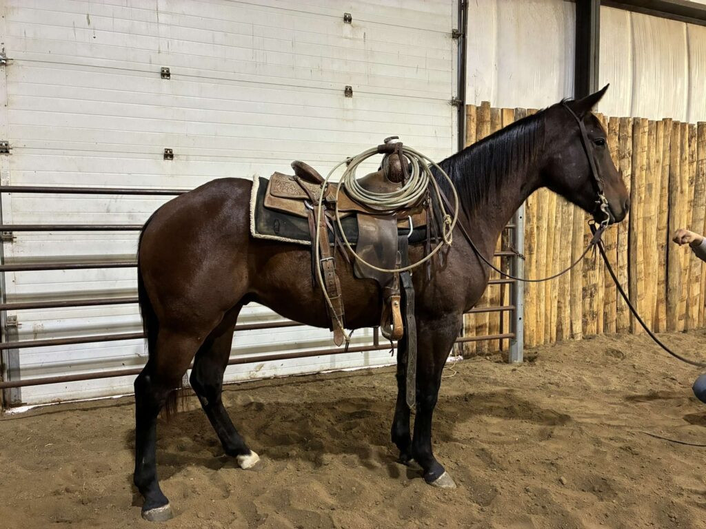 Clark has been used extensively in the feedlot pulling sick cattle, Loading trucks and doctoring. He’s a good minded little gelding that will go wherever you point him. He crosses water, will go through the bog. Clark has also roped the sled and is ready to start in the arena. He lopes pretty circles, knows his leads, and has a heck of a stop. We think Clark would excel as a heel horse or take him home on the ranch. He’s a good minded prospect that will fit anybody’s program.