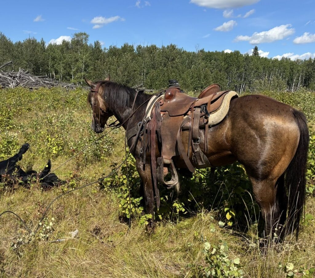 DJ stands 14.2 hh, he is a real eye catchy gelding. Seen lots of ranch miles doctoring and gathering cattle. Drug calves at brandings. Started heeling steers in the arena. Will make a real nice heel horse with bit more time. Or switch him over and make a nice little breakaway horse out of him. Been ridden in the mountains, crosses water and will walk over logs.