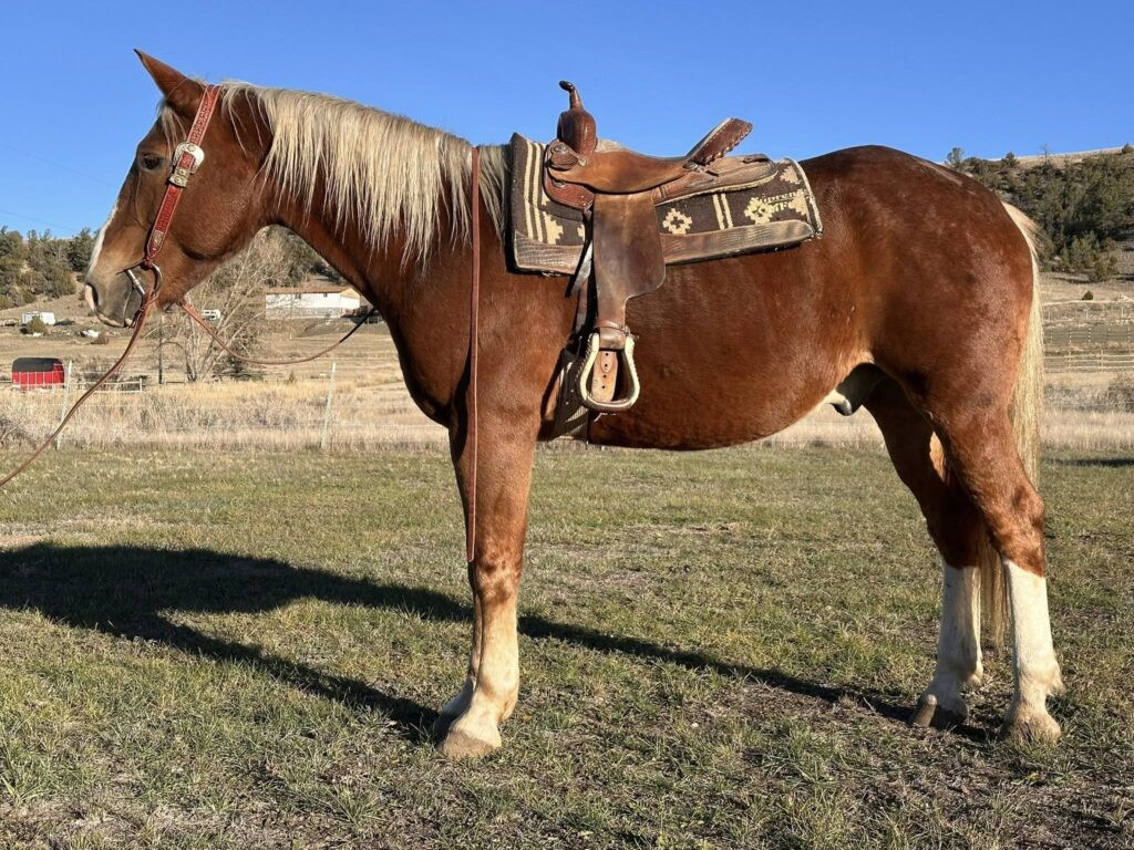 Been used at the feedlot and a local sale barn. He is rugged, sure footed, and has the stamina to work all day. Gets along well with the others while turned out. He’s a nice, big, ranch gelding.