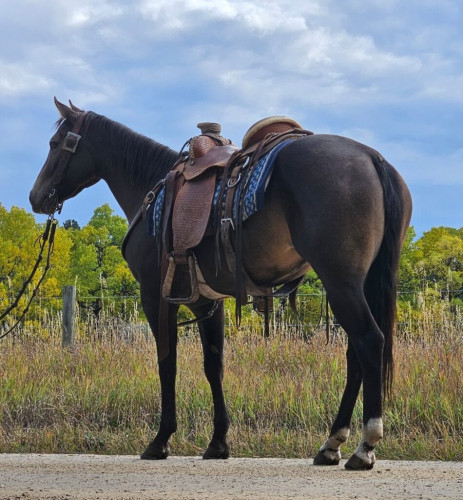 I cannot say enough about this 14.1 hand, cute headed, full hipped 3 year old buckskin mare. She is easy to catch, soft in the mouth, has a good one handed neck rein, side passes, Been ridden both in the arena and mountains. Has roped and flagged colts, is loping the barrel pattern, has lead the pack string, and also been in the string packing elk. This mare stays gentle, has never offered to buck, has been ridden by intermediate riders, is good with the tarps, bullwhips, loads and hauls excellent and good with all other livestock. She has great potential as a barrel horse. Heel horse. Breakaway calf horse or just family riding horse. She will cross water and is used to down timber.