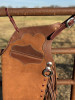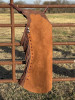 Made in the shop of DW Dixon Saddles by Kat Dixon. Brown Rough Out Small Bell/Shotgun Hybrid Chaps with Fringe.
