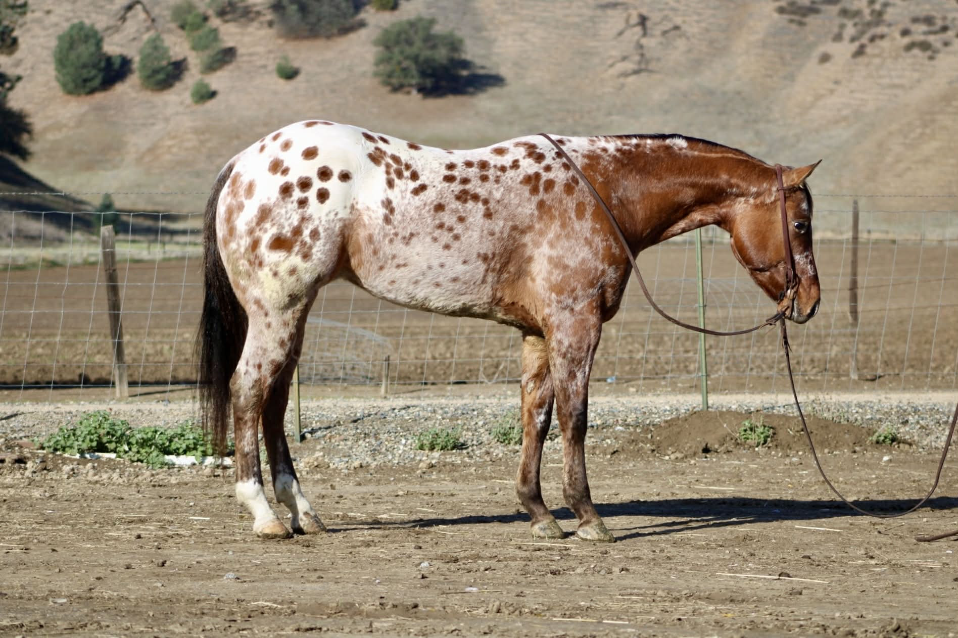 Crime Striker IM –Registered 2020 Appaloosa Gelding, 15.2 Hands • Blanket & Spots • Foundation Appaloosa Breeding. If you’ve been searching for your next lifelong companion — the kind you can trust, enjoy, and rely on for years — Crime Striker IM deserves a serious look. He isn’t just a pretty gelding with color. He’s the result of generations of purposeful Appaloosa breeding, and he carries himself with the steady, thoughtful way that comes from a good mind paired with a good upbringing. Crime Striker IM already has real miles under his belt and a solid foundation that shows the moment you sit on him. He goes low-headed, stays soft in the bridle, and lopes a clean, correct circle. His stop is smooth, his cadence is natural, and he rides with the kind of level, settled mindset that makes every ride feel the same — honest, dependable, and uncomplicated. He’s seen all the right things: flags, tarps, bridges, water, rocks, brush, and open country. He meets each obstacle with a thinking attitude, never in a rush, never bothered. Out on the trail he’s steady and sure, willing to ride out alone or with company, and comfortable in new places. He’s gathered cattle, stepped through ranch chores, and carries himself like a horse raised to handle real work without fuss. At 15.2 hands, he has the size and movement to shine in either Western or English tack. He’s been ridden English and carries a long, sweeping stride that gives him a polished look in any arena. Whether you want a versatile ranch gelding, a handsome all-arounder, or an elegant English prospect, he’s got the build, the style, and the brain to fit the job. His pedigree backs all of this up. Crime Striker IM is sired by Star Striker IM, a horse tracing back to Awestruck, a line known for good bone, dependable minds, and lasting soundness. His dam, Dunes Desire, brings in Imaginate and The Crime Seen, foundation Appaloosa names known for producing correct, durable, sensible horses with the kind of disposition people look for. This is a gelding bred to last. Around the barn, he’s just as easy. Friendly, kind, and straightforward to handle. He meets you at the gate, stands quiet to clip, tie, shoe, and saddle, and settles easily in a stall or pasture. He hauls well, steps off relaxed, and carries himself with a maturity that’s impressive for his age. Crime Striker IM is a young gelding with miles, manners, color, and the kind of foundation you can build a lifetime on. If you’re looking for a partner you can enjoy now and appreciate for many years to come, he’s standing here ready.