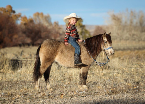 Brandy is a fancy, registered buckskin pony that stands 40″ tall and weighs 320 pounds. She is super sweet, easy to catch and loves kids. She has been rode by kids of all ages, in the mountains and all over the ranch. She will go where you point her, rides by herself or with a group. She is easy going and laid back. Note from Ian: Both my little sister and I have personally rode this pony and she is very nice. Willing to hold for up to 10 days at no charge and can help arrange transportation.