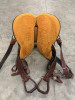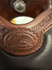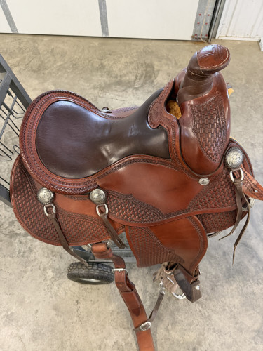 Handmade wood tree covered with a fiberglass wrap, leather groundwork anchors all tree parts; Arizona bars that are low rock and fit modern horses perfectly. Bar angle is 93 degrees, 8" gullet, 12" wide forks, Bowman style 16" pleasure rise seat, inlaid with padded buffalo leather. 4" high oval cantle hand braided with kangaroo lace, horn is 3" high by 3" cap, slight forward lean; reinforced skirt rigging with D’s in both front & rear. Comes with 2" Nettles stirrups.