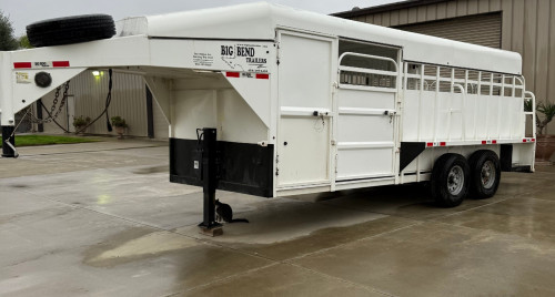 2020 Big Bend 20’x 6’8” full to, 3’ walk in tack with swing out saddle racks, 4’ escape gate driver side, rear butterfly gates, center floating gate, cleated floor, electric over hydraulic jack.