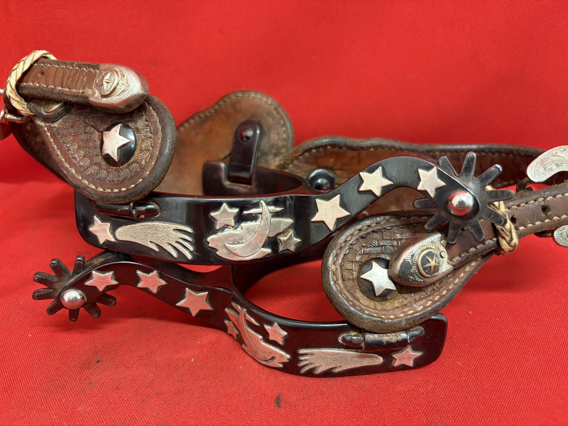 Ray Maheu spurs that are marked MAHEU. Sterling mounted with good straps featuring 1 3/16" rowels, 2 1/2" shanks, 1" bands, and 3 1/8" heel openings that can be adjusted. By one of the top makers in the performance horse world. We pay shipping within the 48 states. We accept most forms of payment