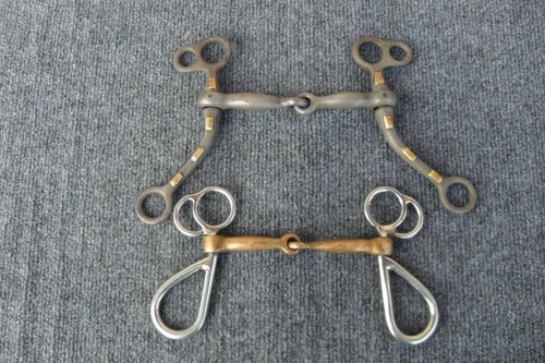 Two pre-owned unmarked bits for one price. Nice TRAMMEL facsimile colt bit features 51/8” copper mouth with 5” shanks. The longer bit has a very desirable shaped 5” mouthpiece and brass overlaid 7” shanks. $95.00 includes shipping to the lower 48.