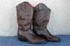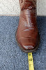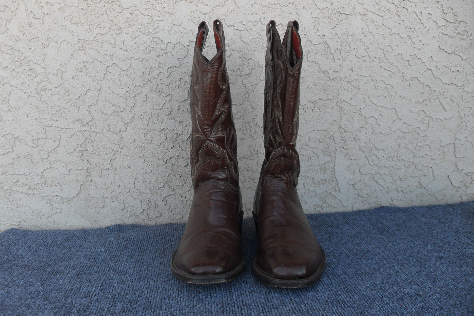 Best of material and workmanship in this pair of handmade, made to order boots. Although there is no makers mark or size listed through the process of elimination it has been determined they are 8 1/2 D. Nine rows of attractive stitching adorn the 14” tops. The sole measures 4” at its widest point---11” long . Near new condition $195.00 includes shipping to the lower 48.