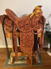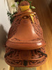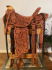 Here’s a new working WADE ranch saddle made by Ted N. Estes of Estes Saddlery in Ball Ground, GA. This wade is built on a Warren Wright tree- 16” x 4” with a 10” swell- heavy duty tree and number 1 "select" 13/15 oz. saddle- skirting. Saddle is fully hand- carved/stamped with a 2X mixed floral design and a dyed background. Harwood stainless steel hardware throughout with 4 1/2” lined stainless Fandek Monel stirrups. The rig includes a doubled/stitched rear cinch AND collar (see photo 1). The horn has a genuine buffalo hide wrap (grips the rope much better than elk or mule hide and more durable). This saddle is built for heavy duty use and offers a ground seat second to none in comfort. Any saddler will tell you the longest lasting saddle- is one that fully hand stamped/carved. Call or text 678-677-7332 for additional information/details.