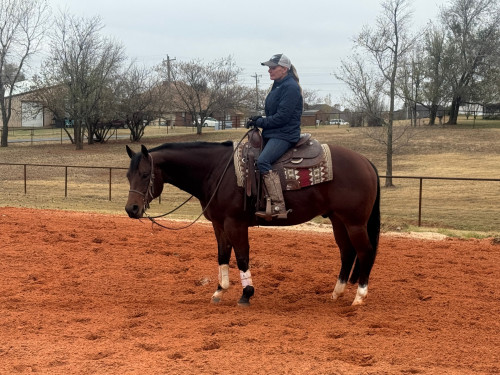 15.0 hand, super quiet boy that has done everything we have asked. By the Famous Reining Sire NOT RUF AT ALL who won the triple crown of reining. "Tyson" would be great at Versatility Ranch Horse, Ranch Riding, Roping (Head Horse),Trail Riding, Ranch horse. Ridden and enjoyed for the past year by a 73 year old man and his wife. Video doesn’t do him justice as he is extraordinarily beautiful with great bone and feet. He is a perfect gentleman to clip, shoe, haul, bath and absolutely whatever you ask him to do. Spent last winter roping with the husband and trail riding in the desert with the wife in AZ last winter. He rates super as a head horse. Brave on all obstacle challenges he has been introduced to. He loves people and this has been a very hard decision to part with him. Can be tried in Noble, OK until Christmas then in Cave Creek, AZ for the winter.