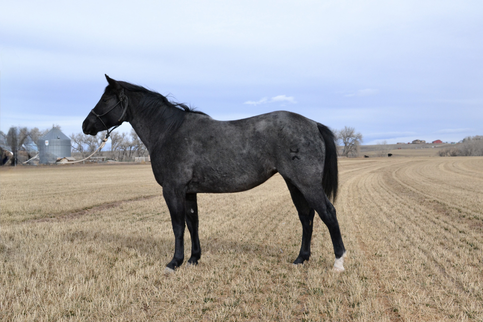 "Bee" is an attractive blue roan mare with intense Driftwood bloodlines helming from the Open Box Rafter Ranch. She has the genetics of great rope & rodeo horses top and bottom, and after 90 days of riding, we are seeing her bright future ahead! Bee just came home from training with Conner James, a  renowned reined cow horse trainer in Wheatland, WY. She now rides proficiently in the arena, has gathered cattle outside, and has even roped a buffalo on her own! She has proven to be good minded, sure footed, and ready for whatever you throw her way. Bee is easy & mature to handle on the ground. She shows great bone & size as her genetics would suggest. This gorgeous mare has the athleticism and disposition to thrive in any western discipline. Come check her out at our ranch in Wellington, CO.