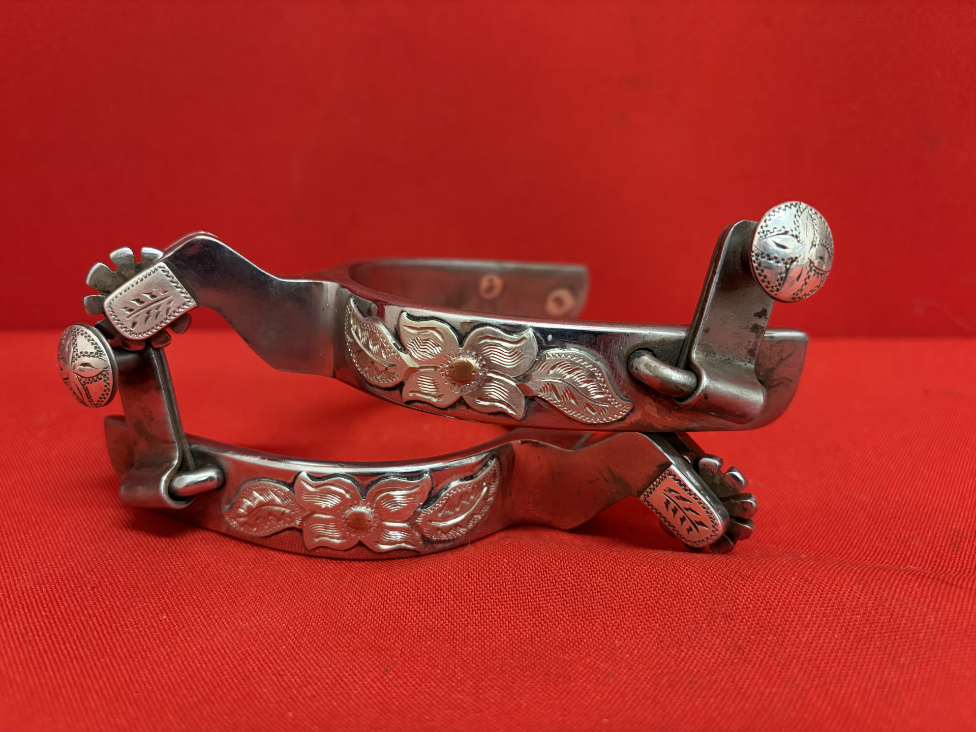 Spurs by western Oklahoma maker Dickie Tignor and marked DICKIE T 421. They originally had initials and some one removed them and mounted them with flowers. In excellent condition with 3/4" rowels, 1 5/8" shanks, 3/4" bands, and 3 3/16" heel openings. Hard to find in this style. We pay shipping within the 48 states. We accept most forms of payment.