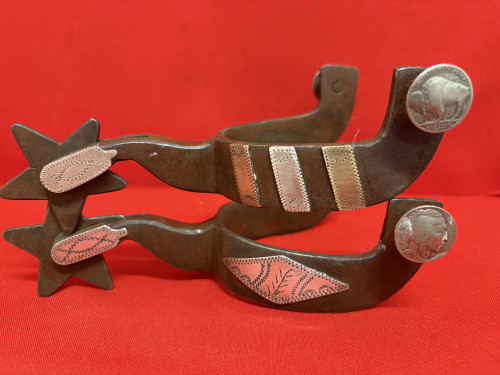 Shop made spurs mounted with sterling and copper marked PK. Feature 2" rowels, 3 3/16" heel openings, 1" bands, 2 7/8" shanks. In what appears to be unworn condition We pay shipping within the 48 states. We accept most forms of payment.