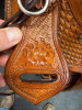 This saddle features a 15" hard seat, 4" cantle, huge 14" swells with a beautiful leg undercut, post horn with leather dally wrap, 6 long leather ties, 7/8 drop rigging, breast collar dee rings with a matching breast collar (I don’t believe the breast collar he made), back cinch, 6 1/4" gullet, SQH bars, built on his famous Bob Ray handmade rawhide wrapped trees, fleece is good, brand new angled stirrups added, new off billet, new latigo, new cinch, and weight is around 42lbs.