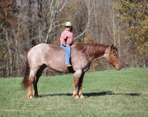 Grady is a beautiful true red roan and he will build your confidence levels!!! He is a 16.1h, 5 years old, draft cross Gelding! He is a big stout built guy but he is light on his feet, lopes around as soft and easy as a 14h horse, takes the correct leads, lopes nice circles, reins around and stops with ease! He is totally safe for any age and any level of rider and has been ridden by our 6 year old. He has been ridden inside and out. Grady loves attention and is as friendly as they come plus he is very calm natured! He has been ridden down the highways and he is traffic safe. He is great on trails and he will cross creeks, ditches, logs and navigate rough rocky areas. He has been exposed to all kinds of wildlife such as deer or turkey and will go anywhere that he is asked too. He has been ridden many miles in the mountains of Eastern Kentucky and encountered every obstacle possible on the trail. He has been on several week-long camping trips. He hauls well and picketline ties also. He will go up or down even the steepest slopes, across deep creeks, over downed trees, and over all types of rough terrain while still being sure footed. He has been ridden around the ranch to check cattle, ride fences and used at brandings to drag calves. If you want one that the whole family will love or years to come, Grady is the total package! Feel free to call Eric 606-308-2461 with any questions.