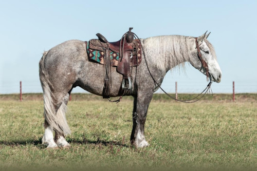 "Shep" 2021 Grey Percheron X Q.H. Gelding. He stands around 15.3 hands. Shep is a very laid-back type of horse. He is so easy going and will do anything you ask. Shep is traffic safe and would fit just about any level of rider. He is a trail horse deluxe!!