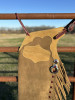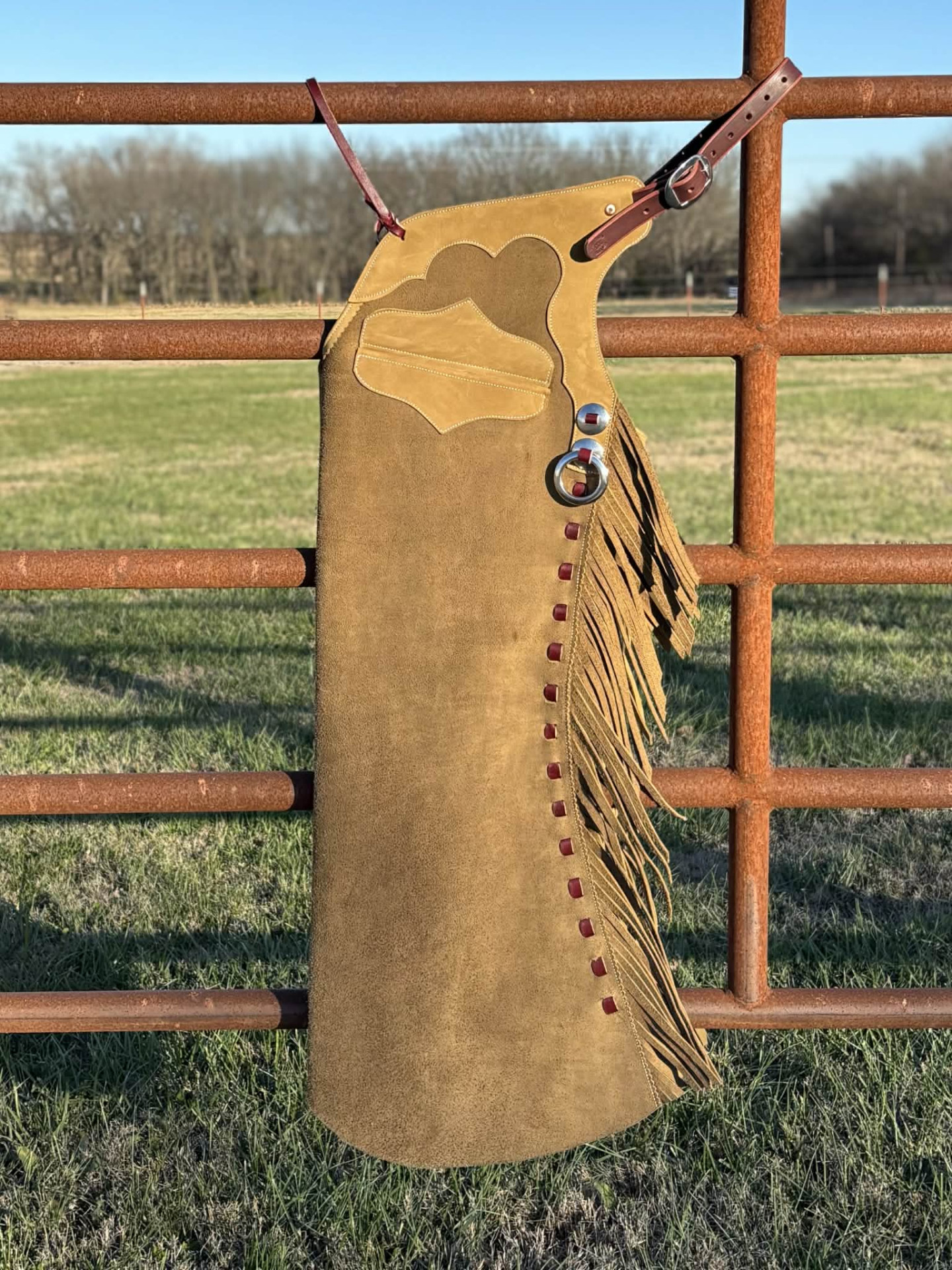 Made in the shop of DW Dixon Saddles by Kat Dixon. Olive Rough Out Small Bell/Shotgun Hybrid Chaps with Fringe.
