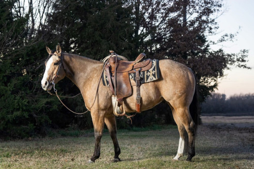8-Year-Old Gelding With Sun Frost x Dash for Cash Lines. MH DUAL FROSTED CASH, known as Dash, is a versatile and accomplished 8-year-old gelding with a proven record both in and out of the arena. He is exceptionally broke, reliable, and suitable for the entire family, making him a rare combination of talent, dependability, and eye appeal. Dash has been successfully competed in multiple events. He is a 2D money-earner in barrels with limited hauling, has clocked low 21s in poles, and won 2D money in mounted shooting at the State Fair. He has extensive ranch and sale barn experience, has been roped on in both the pasture and the arena, and is currently being used in breakaway. He is started on heeling under the guidance of NFR qualifier Joe Day and has recently been introduced to the heading side as well. In addition, Dash has been started over stadium jumps and cross-country fences, showing scope and willingness in the English arena. With over $5,000 in combined earnings and buckles won, his accomplishments reflect both his athletic ability and trainable mind. Beyond his performance credentials, Dash has been the dependable choice for youth riders, proving himself as a safe and consistent kid horse. He is the same every ride, no matter the setting, and adapts easily whether he is on the ranch, in the mountains, at a competition, or on the trail. Sound, sane, and striking in appearance, Dash is the kind of gelding who will continue to succeed in the arena while remaining trustworthy for family use. He is ready to advance in roping, continue excelling in barrels and poles, or transition into nearly any discipline his new owner desires. We welcome you to come out to Kansas & try them. For more information, videos, or to schedule a visit to try him out prior to the sale, please contact Jed at (316) 806-3344.