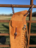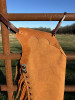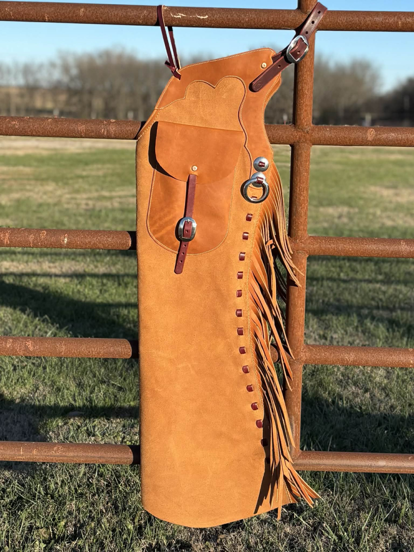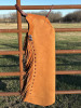 Made in the shop of DW Dixon Saddles by Kat Dixon. Light Rust Rough Out Small Bell/Shotgun Hybrid Chaps with Fringe.