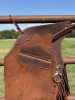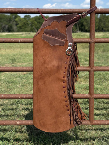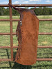 Made in the shop of DW Dixon Saddles by Kat Dixon. Rust Pebble Rough Out Small Bell/Shotgun Hybrid Chaps with Fringe.