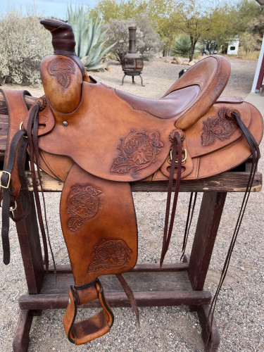 Matt Plumlee, Nevada Saddle Co. Rawhide covered wood tree. Gullet 61/4” x 8” high. Cantle 41/2”. In great shape. Rope, ranch, trail, secure comfortable seat for long rides.