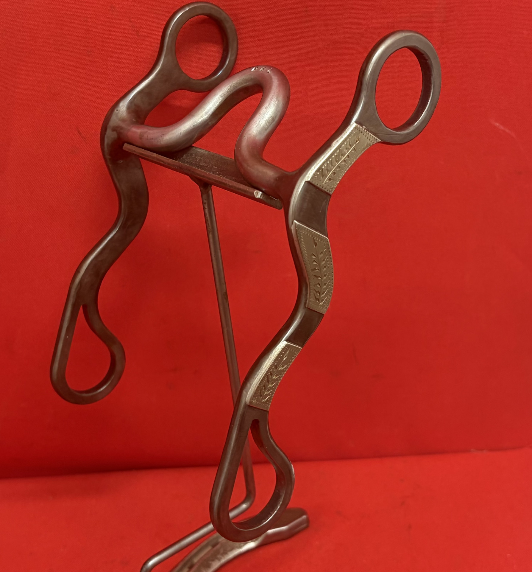 PRC marked unridden bit by long time Oklahoma maker Pat Ray Castleberry. It Features 5" mouth and 7 1/4" cheeks with hand engraved overlays. We pay shipping within the 48 states and accept most forms of payment.