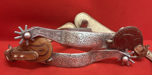 Nice pair of silver overlaid spurs in good using condition marked mexico. Made in a shop in the area where Fleming, Vogt and others were made. Have vintage leathers that look 1970’s. That would probably be a good date for the spurs. Straps have one keeper loose. No issues with the spurs. The rowels are tight. 2 1/4" shanks, 1 1/8" rowels, 3 1/8" heel openings, 15/16" bands. We pay shipping within the 48 states. We accept most forms of payment.