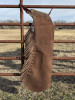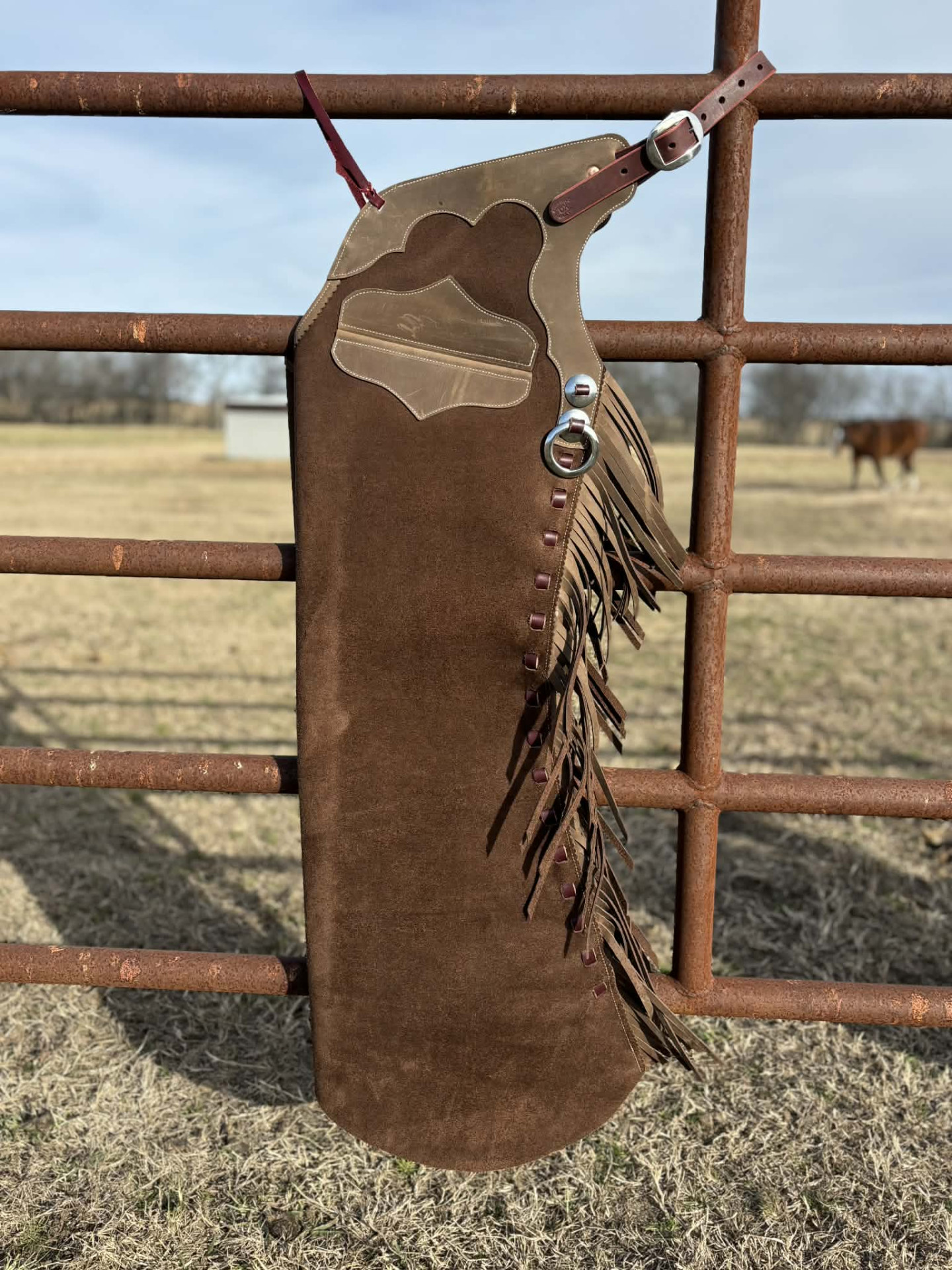 Made in the shop of DW Dixon Saddles by Kat Dixon. Dark Brown Rough Out Small Bell/Shotgun Hybrid Chaps with Fringe.
