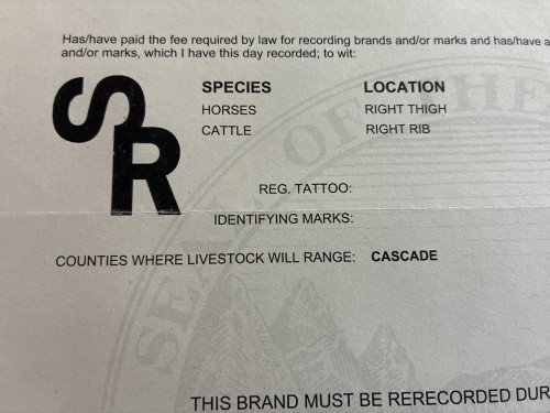 For sale currently registered two character brand, lazy S hanging R. Brand location for Horses-right thigh, Cattle-right rib.