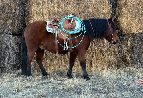 Here’s a 6 year old 13.1 hh pony for you to take home. (Bentley) happily plods along at a walk but when asked he’s as fast as any regular size horse we’ve ever put up against him. Stop, spin, rollback, side pass, neck rein, he knows it all. I’ve dragged some calves on him and roped around a dozen calves out on pasture. I’ve had him for the past 3 years as my go to horse so he has a lot of miles on him trail riding, gathering cattle and much more. Also he’s been in a Christmas walk through pageant where different kids rode him though torches and lanterns and he never blinked an eye. He would suit some one best probably 10up but he is very flexible! call 620-290-4325 for more info. $9,000 obo