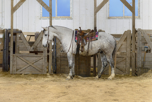 He rides English and Western with effortless transitions; great in the arena, relaxed on the trail, excellent for lessons. Sits quietly on the ground, loads and ground ties. He has been reliable for riders of many levels (confident beginner through experienced).