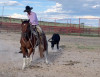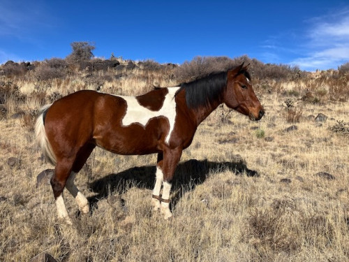 Handy, athletic, gentle ranch mare 14.3hh. Sure-footed in rough country, excellent stamina. Good ground manners, very friendly, raised a foal in 2024. Not ridden extensively until 2025. She has experience in all aspects of ranch work. She can rope and doctor cattle alone outside, and handles a rope well. She has a very fast and smooth extended trot and likes to cover country. She handles pressure well when working in tight situations, sorting, loading cattle - flags, whips, dogs, ropes, tarps, etc. Strong feet, good to shoe. She could be a good heel horse prospect. She’s a reliable ranch horse, but for now she needs an experienced rider who can give her a regular job.