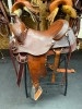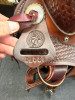 This saddle features a 16" hard seat, 6 1/2" gullet, QH bars, rawhide wrapped wood tree, post horn, 13" swells, 4" cantle, 4 new long leather ties, new back cinch, new off billet and latigo, new front cinch, fleece is in excellent shape, and weight is around 38lbs.