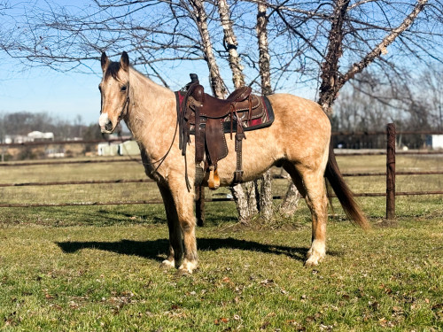 Looking for a confidence builder, a reliable trail mount, or a safe family horse? Meet Silver, a 15-hand Quarter Horse gelding who is as sweet as they come. With his striking buckskin coat and kind eye, he turns heads everywhere he goes Silver has a great work ethic, neck reins well, and has a smooth jog and slow, comfortable lope. He is current on Coggins, vaccines, and dental work silver has Exceptional ground manners. Stands perfectly for the farrier, bathing, grooming, and mounting. Silver is Confident on the trails, crosses water, bridges, and navigates rough terrain without hesitation. if you’re looking for a gentle and save gelding with his whole life ahead of him don’t pass up silver