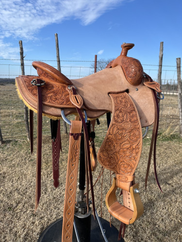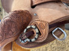 Clint Newman maker, Ray Lewis tree, Hermann Oak leather, Teskey’s/Cowpuncher conchos and rings. 16” seat, call or message with questions to get additional information. Picked up in Hico, TX at cost or shipped in the continental US for additional $100.