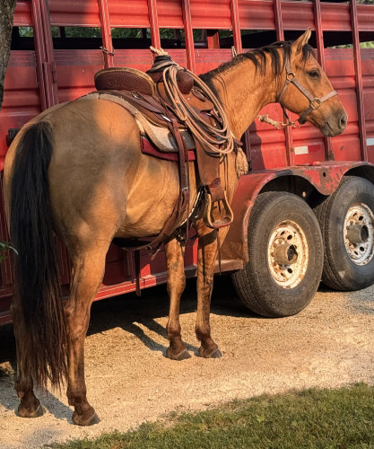 This gelding is a true jack-of-all-trades, and he’s only 6! Cat has seen a lot of country and is always ready to work. He’s been used for moving pairs, sorting, doctoring, branding, breakaway roping, hunting, and the list goes on. In the mountains, he’s sure-footed and dependable, and he’ll move out on a loose, one-hand neck rein. He’ll go wherever you point him with confidence.