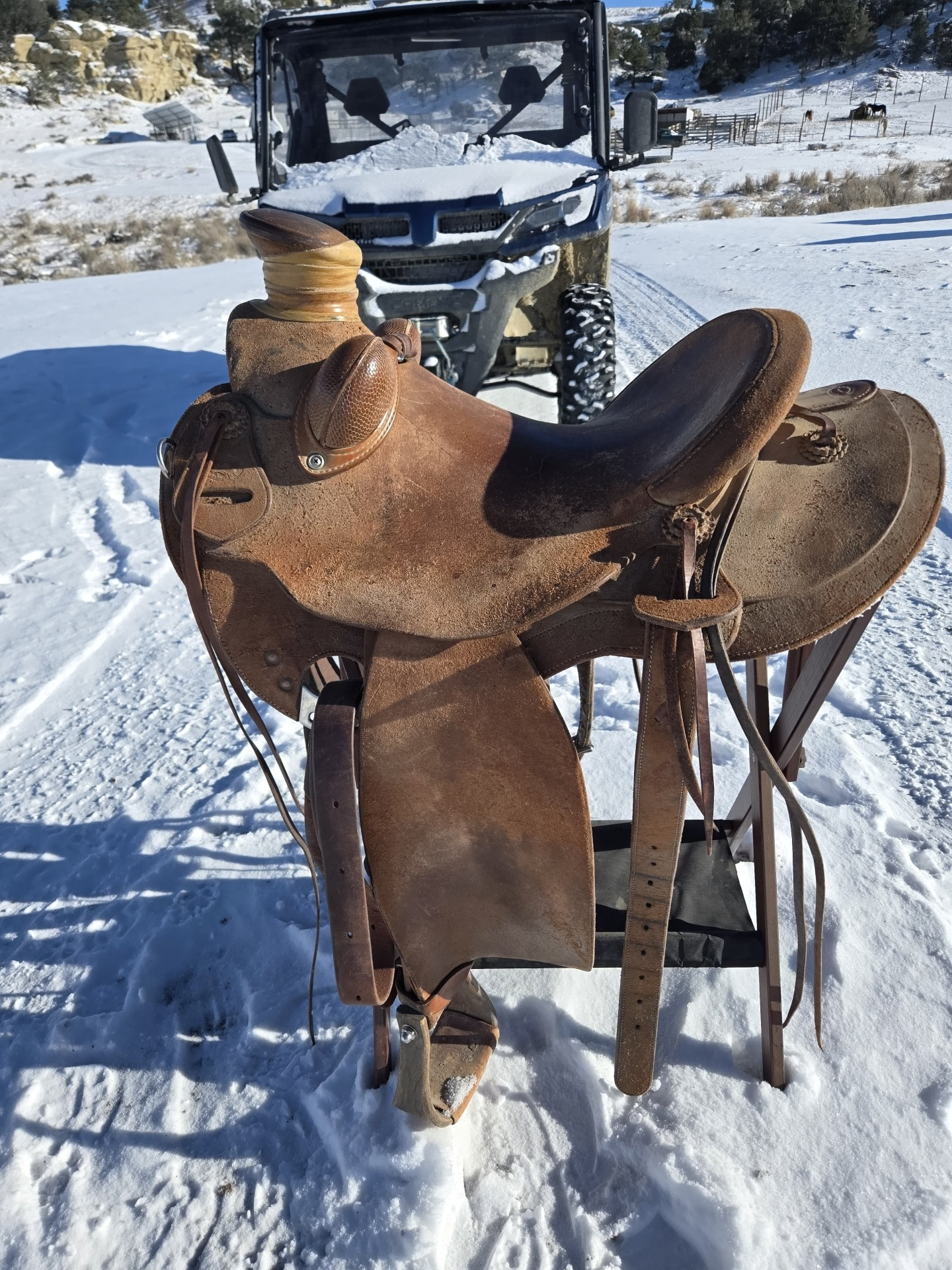 Clint Lundy wade saddle on a dusty Smith tree. 4x90 bars. Great seat to ride all day and never been in any wrecks. Really fits a withered horse nice.