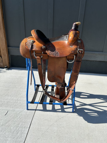McCall-custom saddle built in 1996. Features full custom wrapped horn with rawhide rim, fully leather wrapped stirrups, dark brown leather cushioned seat. Partial rose tooling. Heavy duty D riggings. Has been stored in a dry, clean tackroom for 5 years unused. Seller pays shipping.