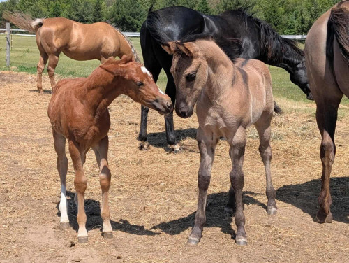 This is a proven cross. He’s the 4th and final of this pairing. I own his dam and half sister and can’t say enough good about their brains and conformation. The adult grulla pictured is his dam. She’s over 1400lb on the scale, not a tape estimate, with bones and feet like they should have with that much body.