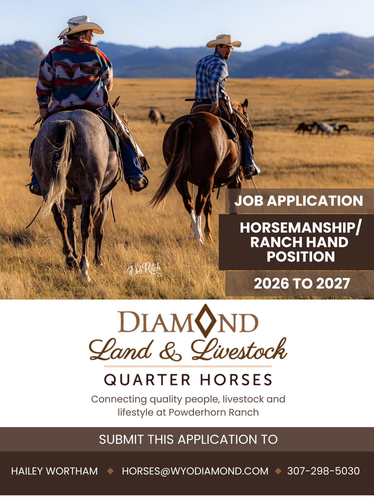 The Powderhorn Ranch/Diamond Land & Livestock is looking for qualified individuals to fill combined horsemanship/ranch hand positions for 2026-2027. Hirees will be assigned a string of horses to ride and train for our sales program, under the supervision and management of our senior staff. Areas of responsibility will also include feeding and barn chores, monitoring herd health and condition, teaching and handling horses from weanlings and unstarted 2-year-olds up to mature saddle horses, and assisting on the ranch with tasks such as fencing, cattle work, facilitating guest horseback activities, and additional duties as needed.