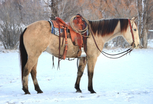"Oscar" - 2018 Buckskin Quarter Horse Gelding. Oscar is family-friendly and gentle gelding that stands 15hh. More whoa than go. He has been used on the ranch trailing cows and checking fence. He is easy to catch, stands tied, good to trim and shoe. He is good with time off. Oscar has been used in the mountains hunting and trail riding. If you need a gentle horse to just walk down the trail, Oscar is your guy.