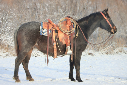 "Chester" - 2021 Bay Roan Quarter Horse X Pony Gelding. Chester is the perfect step-up kids pony. He’s still big enough for an adult to ride. He stands 12hh. He has been used on the ranch and trail riding. Chester is puppy dog gentle and easy to get along with. He has a nice one-hand neck rein and moves off of your legs. Nice stop and turn around. He goes through the obstacle course with ease. Nothing bothers this horse. Whether you want to take him to the ranch or just go for a pleasure ride, this cute little guy will take care of you.