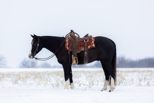 A flashy 4 year old AQHA registered black gelding with lots of chrome. Cuatro can get a job done and will turn heads while he’s doing it. Dependable, versatile, easy to get along with in any environment and just the right size at 15 hands. Cuatro has the experience and ability to go in any direction-an all around, nice gelding that’s easy to handle- bathes, loads and hauls. He has a nice one-hand neck rein, catches his leads and spins correctly both directions. He’s also been exposed to tarps, flags and isn’t afraid of a rope.