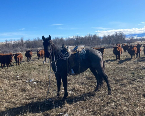 Strong, easy going ranch gelding. He has roping experience out in the pasture or dragging calves to the fire. He’s not fancy or too fast. But he is a perfect horse for your ranch or trail riding needs. His solid feet and good temperament make him a reliable asset to your everyday ranch or trail rider. Sturdy, Gentle, Usable. I’m willing to hold him until February 10th and willing to deliver From Billings to Sheridan.