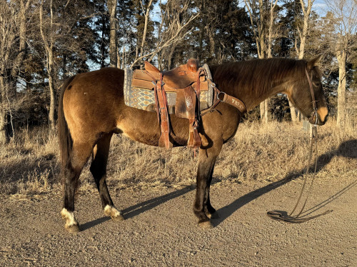 "JJ" 2013 Buckskin Quarter Horse Gelding standing 15 hands tall. He is a veteran ranch horse. Rides with a true one hand neck rein. He is good on his feet in rough country and goes where he is asked. Has a nice ground covering walk and is smooth in all of his gates. Easy to catch and is good with time off.