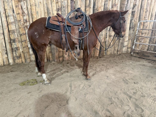 Rambo stands 14.2hh and is stout! Rambo has 90 days riding on him and is super talented! He has worked the flag, roped the hot heels, tracked and roped steers in the area. He has also been used outside doctoring yearlings on pivots. Rambo is good to open/ close gates on, lopes pretty circles and has a nice handle. Stops hard spins both ways and is started on lead changes. Rambo has a lot of talent and should be a top notch rope or cowhorse. He would also excel as a team penner or sorting horse. No buck, good to shoe. Sound!